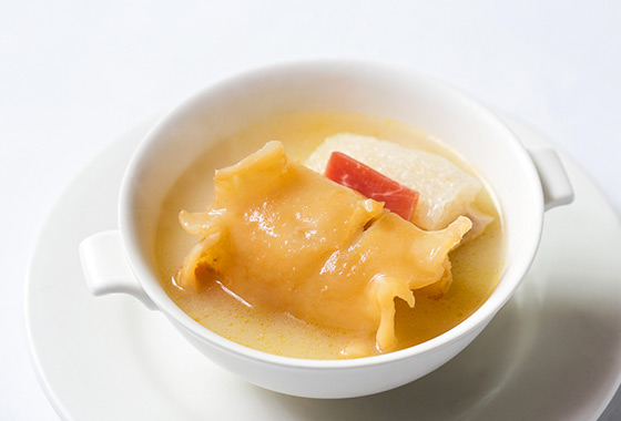 選用四大補品之一花膠,主廚將其用流動的活水浸發一夜後,再與土雞一同熬煮出濃厚膠質,軟Q滑口的花膠鮮美及土雞的甘甜清鮮適口,海陸雙味的交融不僅讓味蕾甦醒,還暖身、暖胃、暖心。