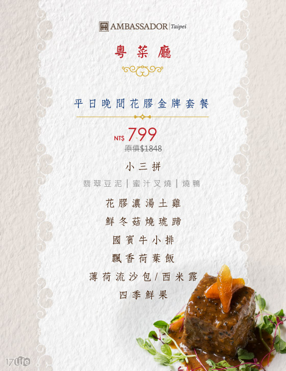 只要799元即可享有【台北國賓大飯店《粵菜廳》】原價1,848元平日晚間花膠金牌套餐:小三拼(翡翠豆泥/蜜汁叉燒/燒鴨)+花膠濃湯土雞+鮮冬菇燒琥蹄+國賓牛小排+飄香荷葉飯+薄荷流沙包/西米露+四季鮮果?